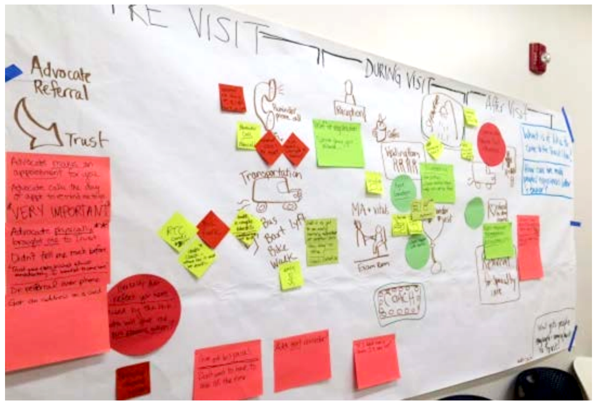I created a giant journey map of the visit experience, listing out existing services. Patients and staff reviewed it and pointed out highlights and pain points in the end-to-end experience with the newly created clinic.